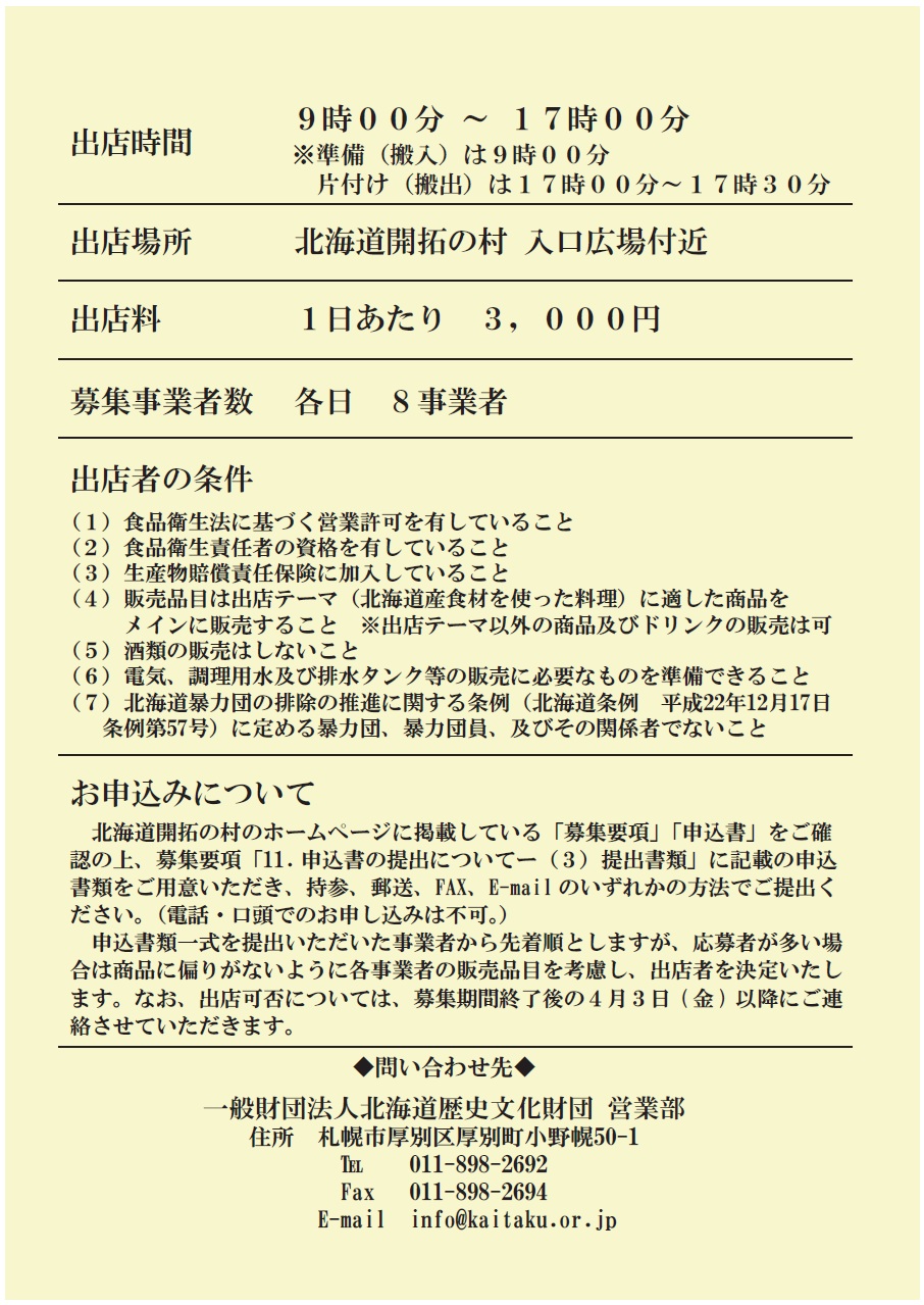 - ゴールデンウィーク期間〔5月3日(日)~6日(水)〕に出店する事業者を募集していましたが、受付は終了しました。