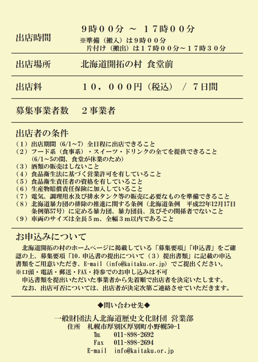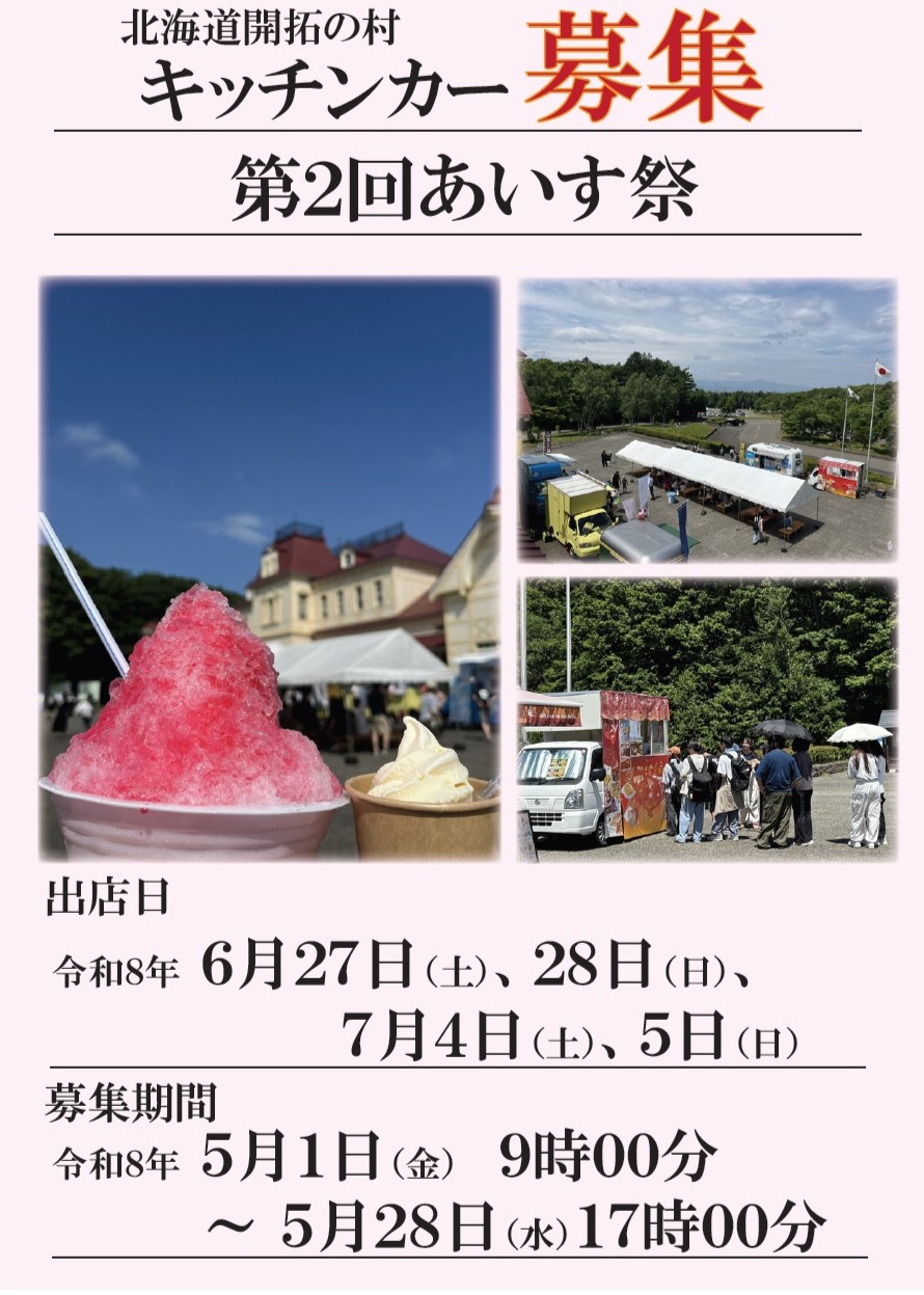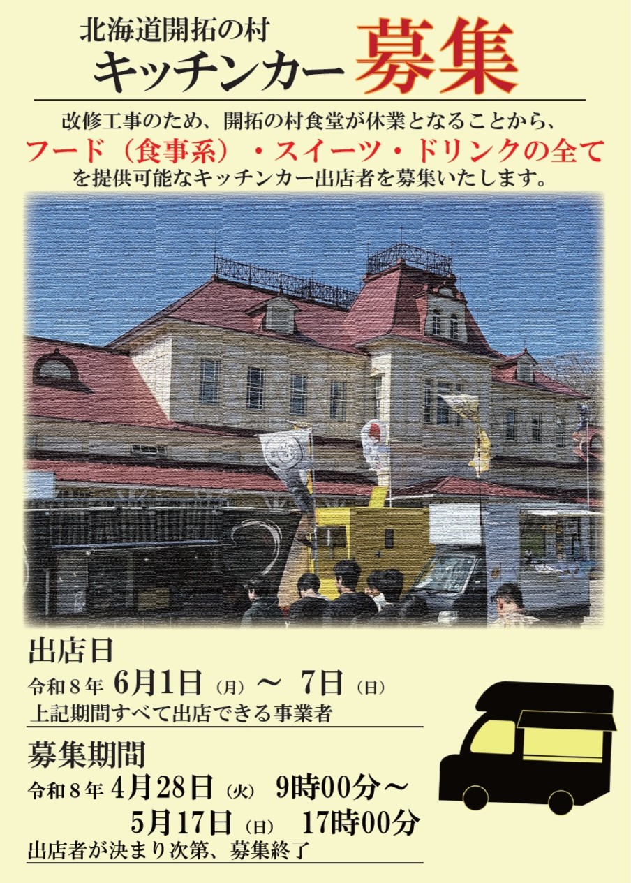 - 開拓の村食堂が改修工事により6月1日(月)~5日(金)に休業することから、6月1日(月)~7日(日)の7日間通して出店できるキッチンカー事業者を募集します。