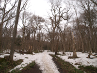 | 鳥たちのさえずりで、森の中は少しにぎやかでした。キツツキのドラミングも聞こえ、耳で春を楽しめる季節です。 園内には湿地が所々にあり、多くは雪に覆われているのですが、湿地は周りより少し雪解けが早いように見えます(写真)。湿地で多く見られるミズバショウの開花はもう少し先ですが、ゴールデンウィークが始まる頃から期間内に見頃を迎えると予想しています。当たるかな? (普及啓発員 濱本) |