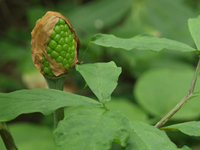 | 昨晩から雨が続き、気温も17度までしかあがらず、エゾハルゼミの鳴き声は一度も聞くことができませんでした。 大沢口にひっそりと緑色の実を付けている小さな木を見つけました。50cmほどにしかならないナニワズ(Daphne kamtschatica var.jezoensis Ohwi)です。夏になると葉を落とすため別名ナツボウズと呼ばれています。葉の色が黄色くなってきているので、そろそろ落ちるのかもしれませんね。実が赤く熟す頃には葉が全て落ちてしまっていますよ。 (普及啓発員 濱本) |