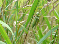 | 今日は一時雨が降りましたが、湿度も65パーセントとそれほどあがらず、比較的過ごしやすい日でした。 コエゾゼミに負けないぐらい元気に鳴いているのは、ハネナガキリギリス(Gampsocleis ussuriensis)です。草丈の高い所で隠れるようにして鳴いているので、なかなか姿を見ることは簡単ではありませんが、探せた時の喜びは本当に嬉しいです♪ こちらの気配を感じると草に潜ってしまうので、焦らず急がずがポイントですよ。 (普及啓発員 濱本) |